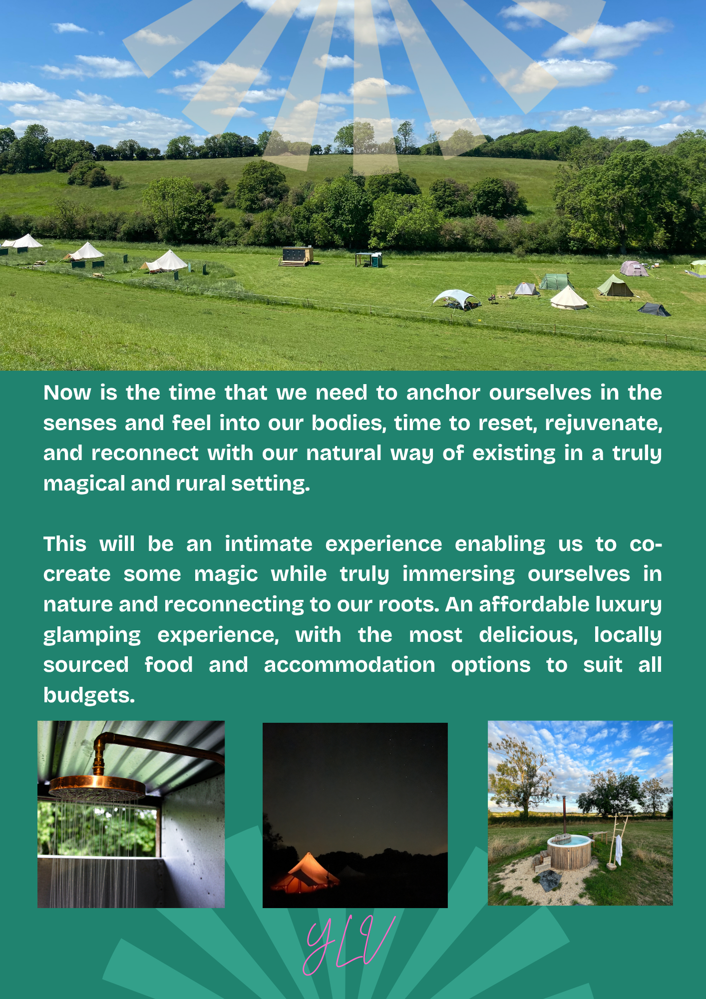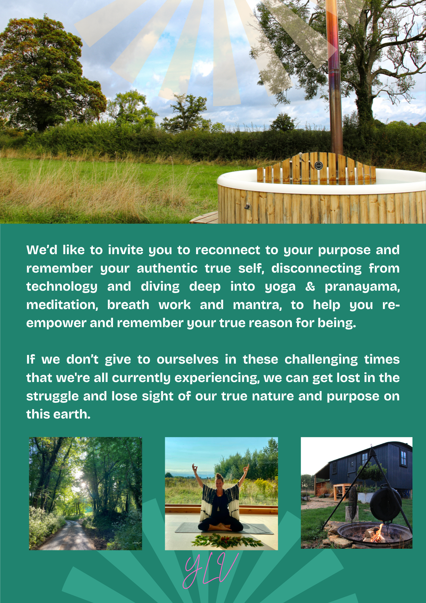 Now is the time that we need to anchor ourselves in the senses and feel into our bodies, time to reset; rejuvenate; and reconnect with our natural way of existing; in a truly magical, rural, setting. If we don’t give to ourselves in the current challenging times that we're all experiencing, we can get lost in the struggle and lose sight of our true nature and purpose on this earth.